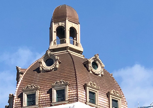 The Sun Tower is a notable landmark of 17 stories (82 m / 269 ft) capped by a Beaux-Arts dome and cupola built-in 1912. It was designed by architect William Tuff Whiteway. The building takes the form of an eight-story, L-shaped block, surmounted by a nine-story hexagonal-section tower. The tower's structure is steel, which is dominantly clad in a combination of terracotta tiles and rusticated brickwork. The tower is topped with a dome and cupola that were originally roofed with terracotta tiles that were painted at a later date to resemble patinated copper. The terracotta tiles had exceeded their practical service life, and it was time to replace the roof.