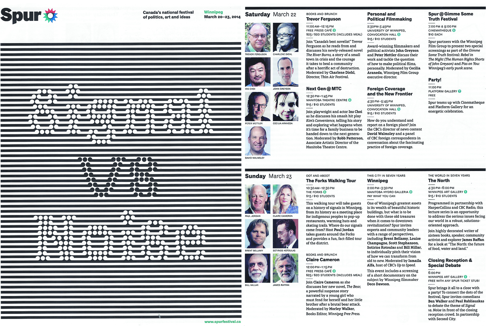 Spur: Signal vs. Noise Winnipeg Spur Festival. The City in 7 Years. March 23, 2014. Speakers: Brent Bellamy, Mariane Cerilli, Sotirios Kotoulas, Dr. Jaqueline McLeod Rogers, Scott Stephanson, Bill Millar.Moderated by Ismaila Alfa (CBC).http://www.winnipegfreepress.com/arts-and-life/ent...http://spurfestival.ca/winnipeg/events/winnipeg-th...
