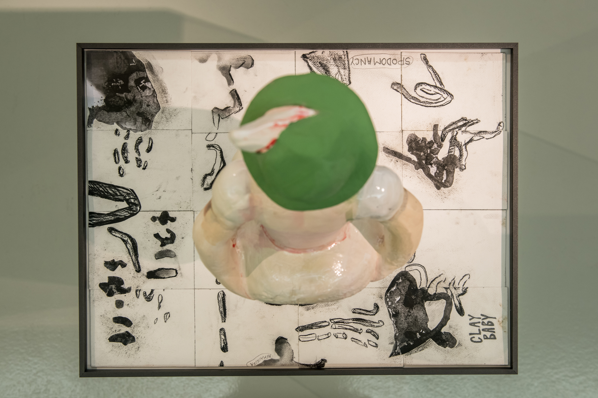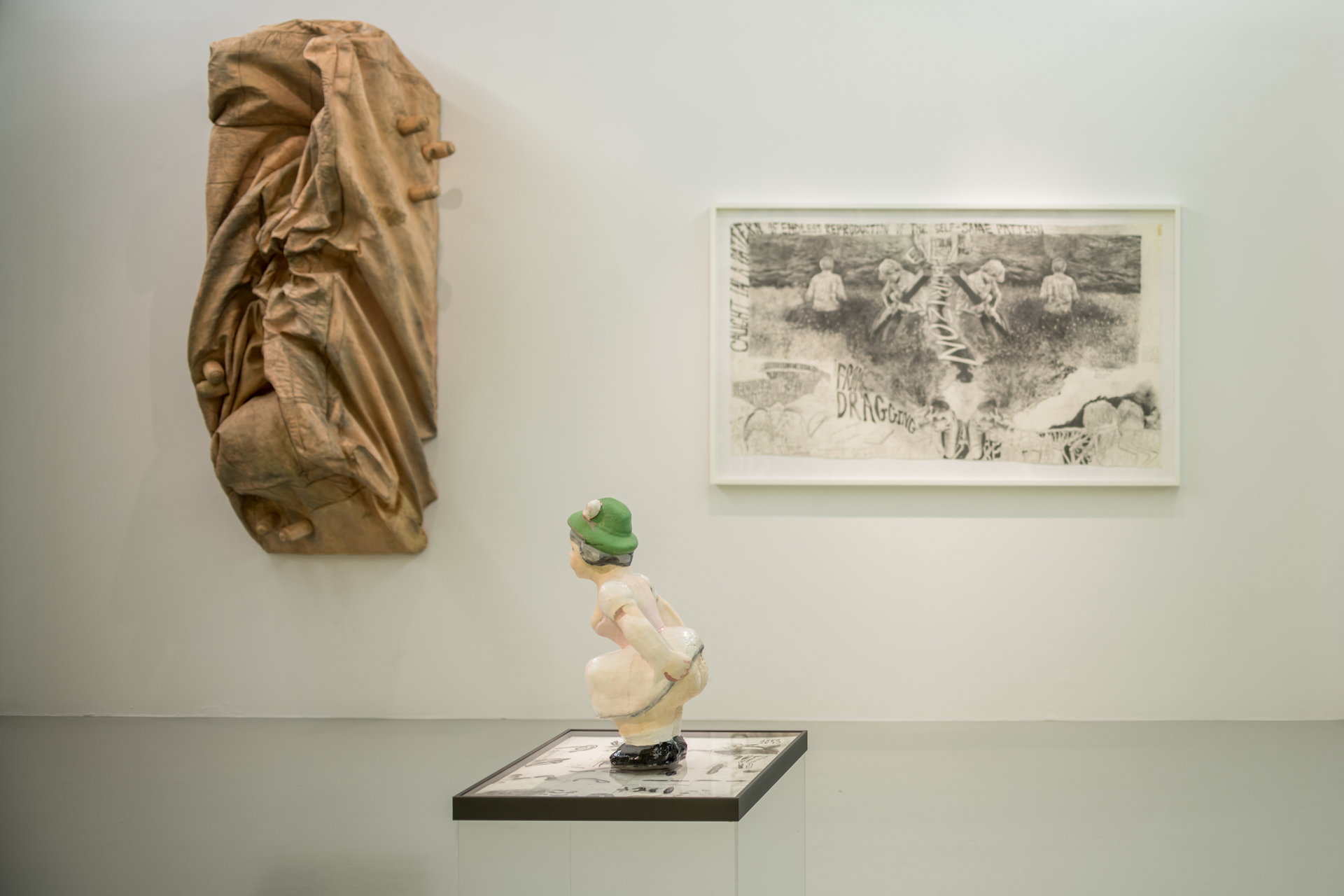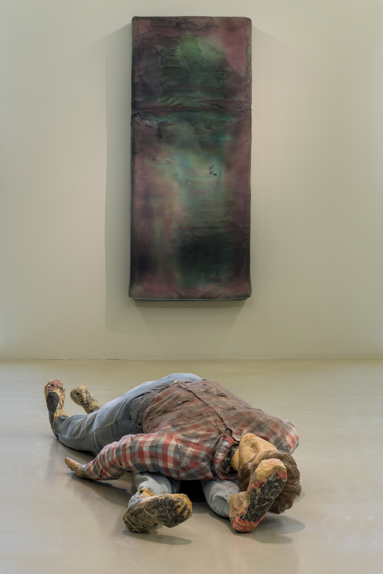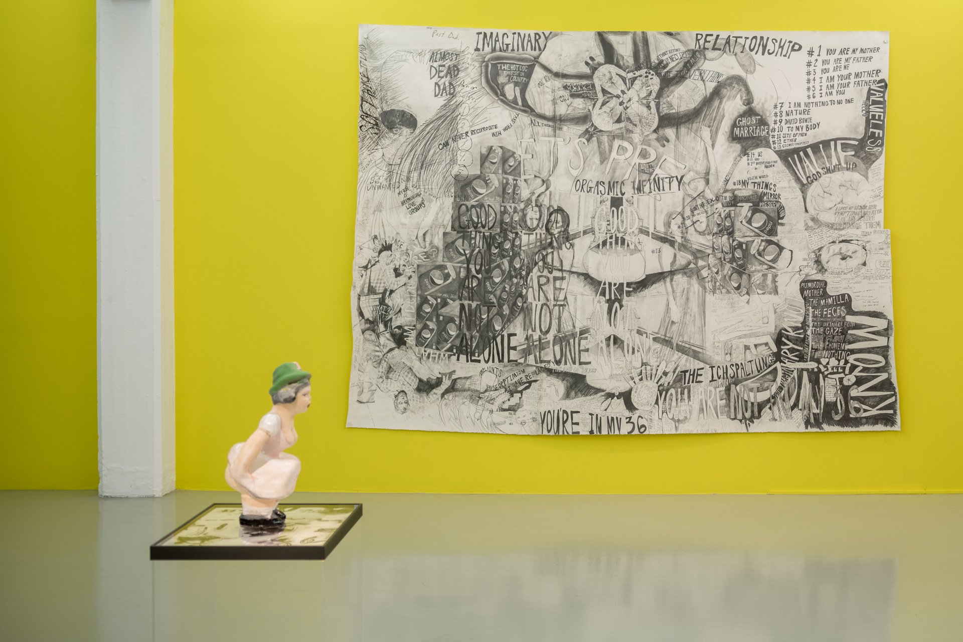 Over her brief yet prolific 15-year career, Kaari Upson developed an elaborate universe woven out of memory, conjecture, fact, and fiction. Imbued with a mystical animism, each sculpture, painting, drawing, and video merges personal and collective traumas, desires, fears, and fantasies. For Upson the key to accessing oneself could be found in one’s possessions, especially those contained in the home. Upson’s interest in domesticity grew out of The Larry Project (2007–2012), a series of works in which she investigated the psyche using a mysterious neighbor, whom she later called “Larry”. Having acquired a significant amount of his personal belongings Upson obsessively researched him giving rise to an astonishing body of work about a man she never met. In several videos Upson appears in multiple roles playing a version of herself, a twin, a lover, her mother, a friend—all while reenacting, theorizing, and questioning aspects of domesticity, personae, and interpersonal relationships. Other works in the series include the iconic “Kiss” painting diptychs, in which she smashed together a portrait of Larry and a self- portrait, while the paint was still wet to create a distorted merger of the two characters. Upson also brought the characters to life by creating a life-size doll of Larry that features in the videos and was later cast in charcoal along with one of herself.
