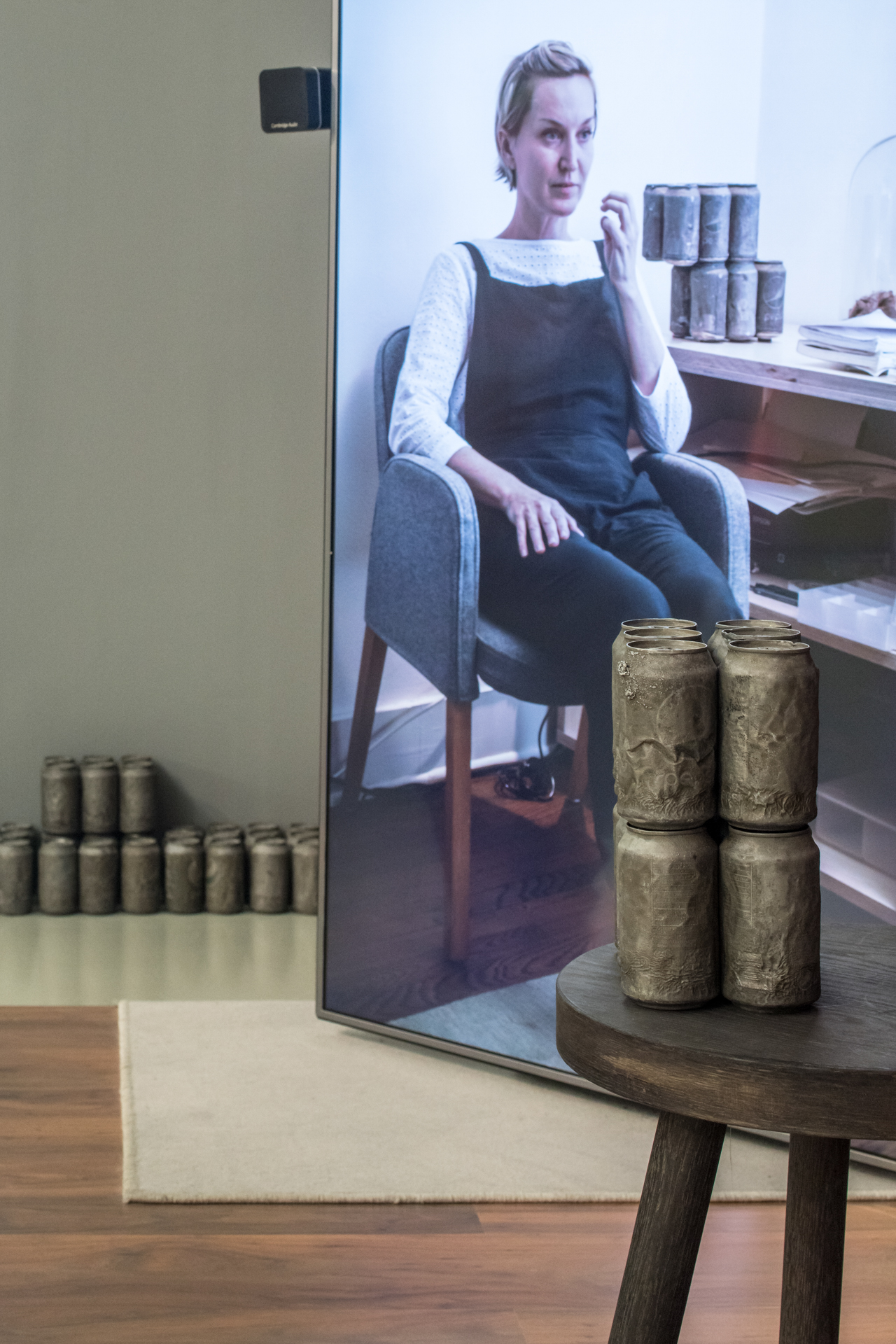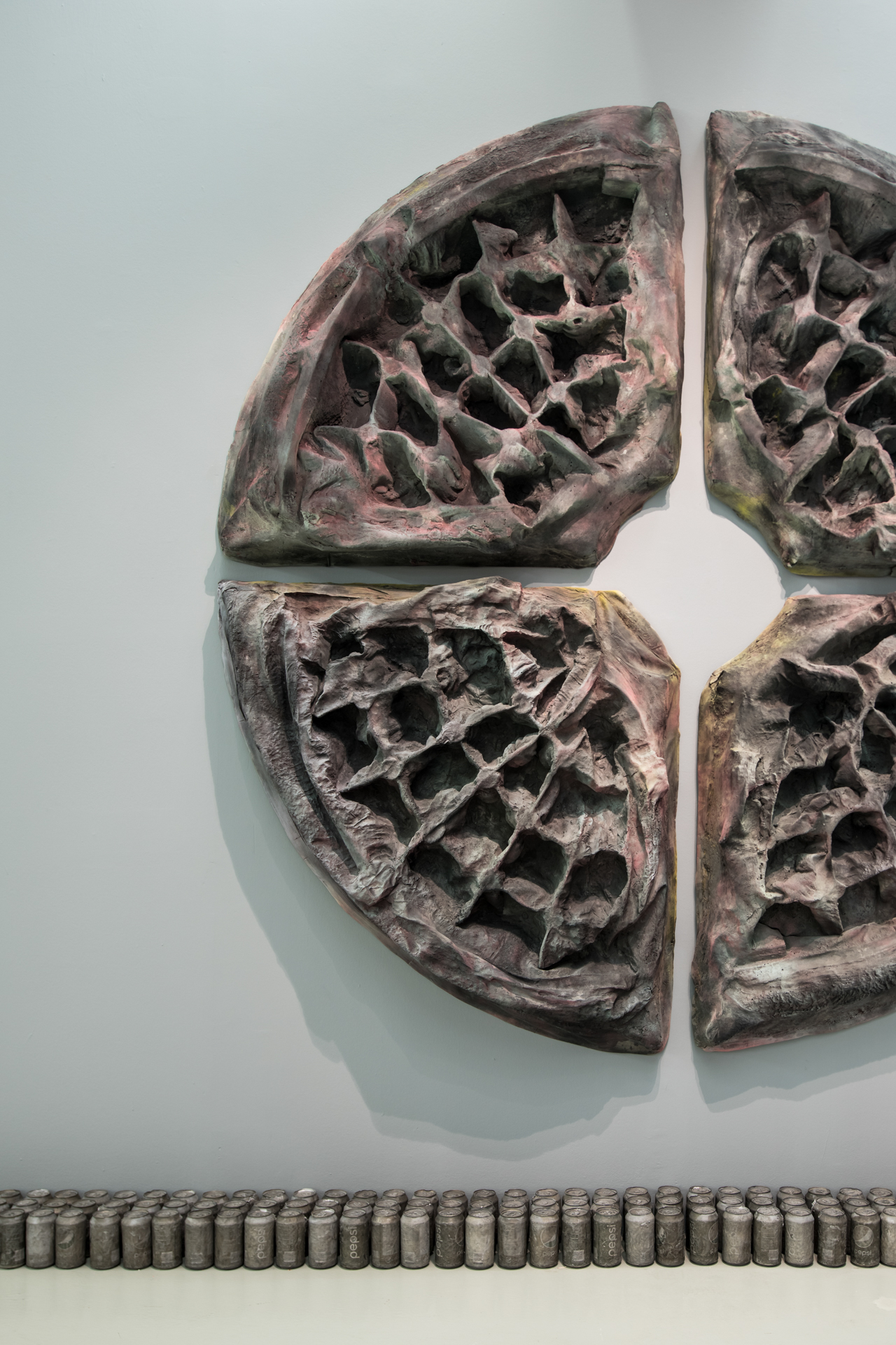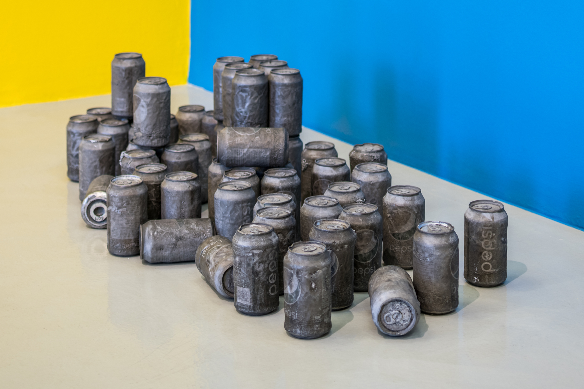 Later, for the series MMDP (My Mother Drinks Pepsi) (2014–2017), Upson turned to her own mother—who enjoyed a Pepsi every day expressing her satisfaction with an audible “Ahhhh” for each can popped—playing her in a series of videos and drawings, and creating life-size dolls of her, which doubled as cat beds. MMDP also comprises complex sculptures made of Pepsi cans reminiscent of ancient artifacts—an effect created by filling the empty soda containers with liquid aluminum so that their surface looked charred—as well as videos that feature the artist among aisles of Costco megastores where her mother shopped frequently.