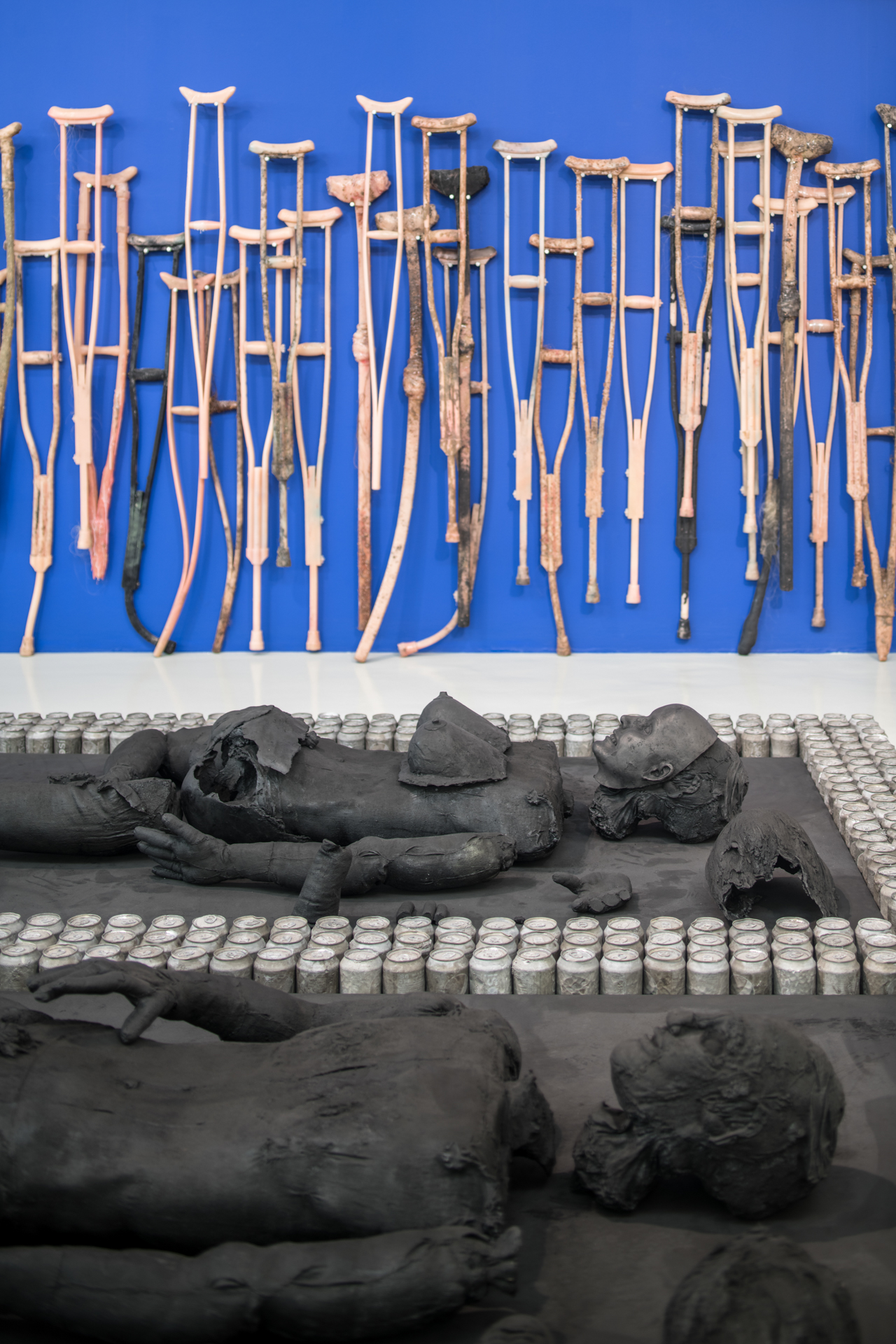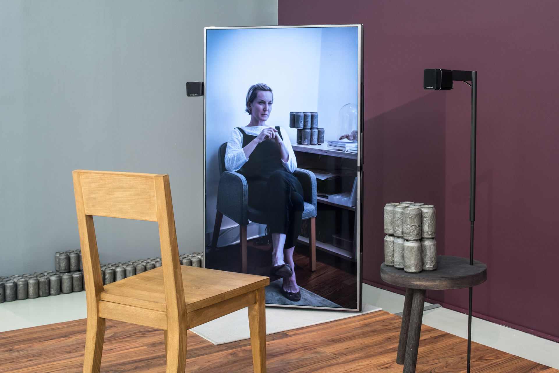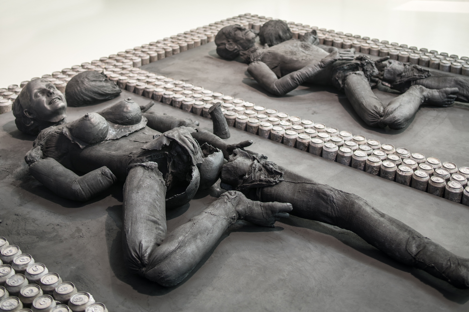 Later, for the series MMDP (My Mother Drinks Pepsi) (2014–2017), Upson turned to her own mother—who enjoyed a Pepsi every day expressing her satisfaction with an audible “Ahhhh” for each can popped—playing her in a series of videos and drawings, and creating life-size dolls of her, which doubled as cat beds. MMDP also comprises complex sculptures made of Pepsi cans reminiscent of ancient artifacts—an effect created by filling the empty soda containers with liquid aluminum so that their surface looked charred—as well as videos that feature the artist among aisles of Costco megastores where her mother shopped frequently.