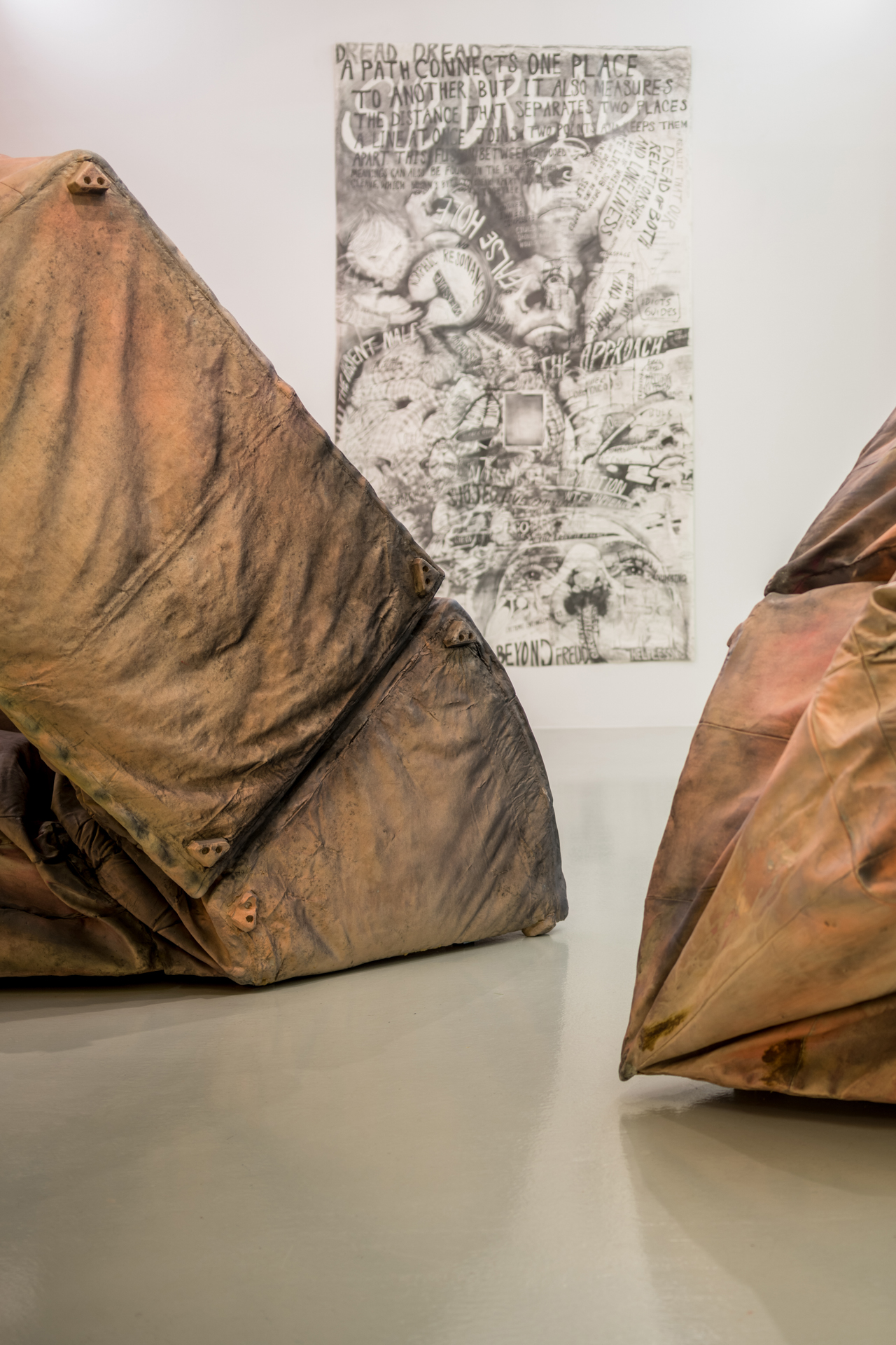 Throughout these projects, graphite drawings often provided the springboard for accompanying sculptural works. Large-scale and reminiscent of detailed journals, Upson’s drawings are reflective of her rapid-fire brain, mapping out a web of connections, references, and ideas, providing both insight and confusion, clues, and tangents. Filled with precisely rendered images and text, they often took years to complete as the artist repeatedly returned to them to add visual, temporal, and intellectual layers to their lush surfaces.