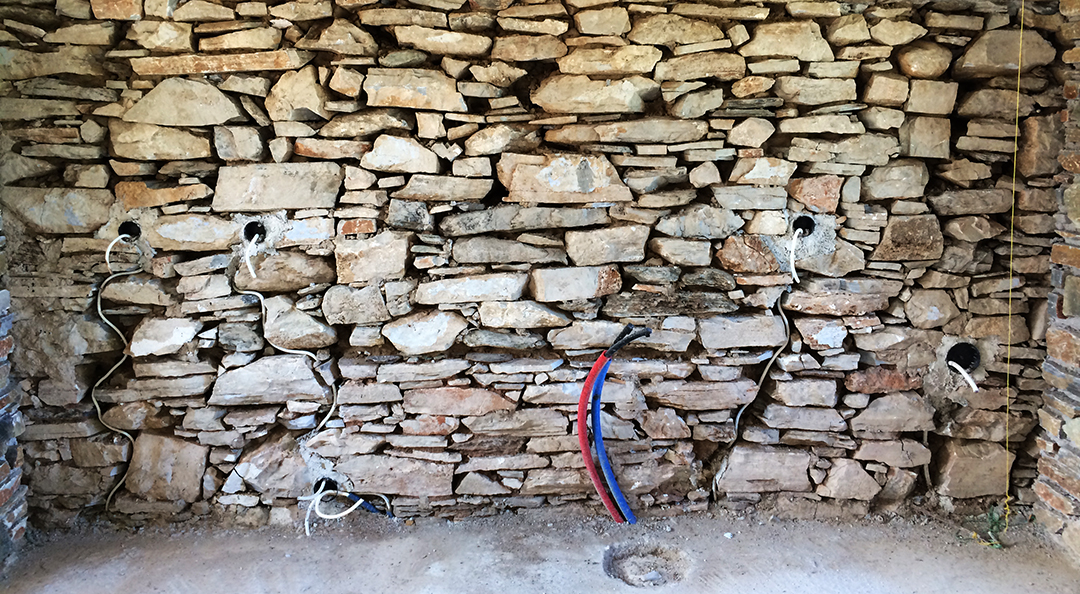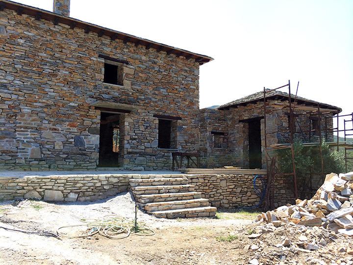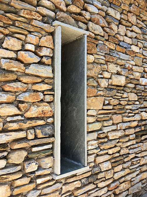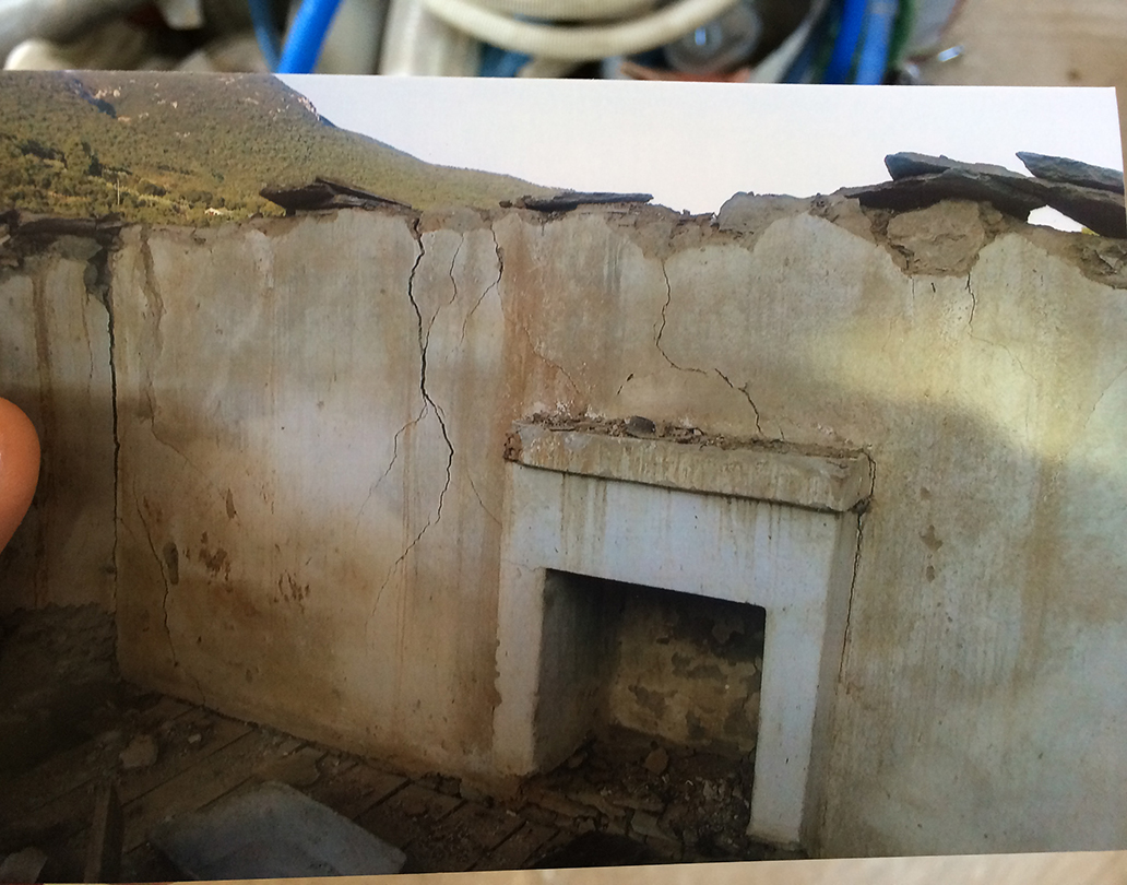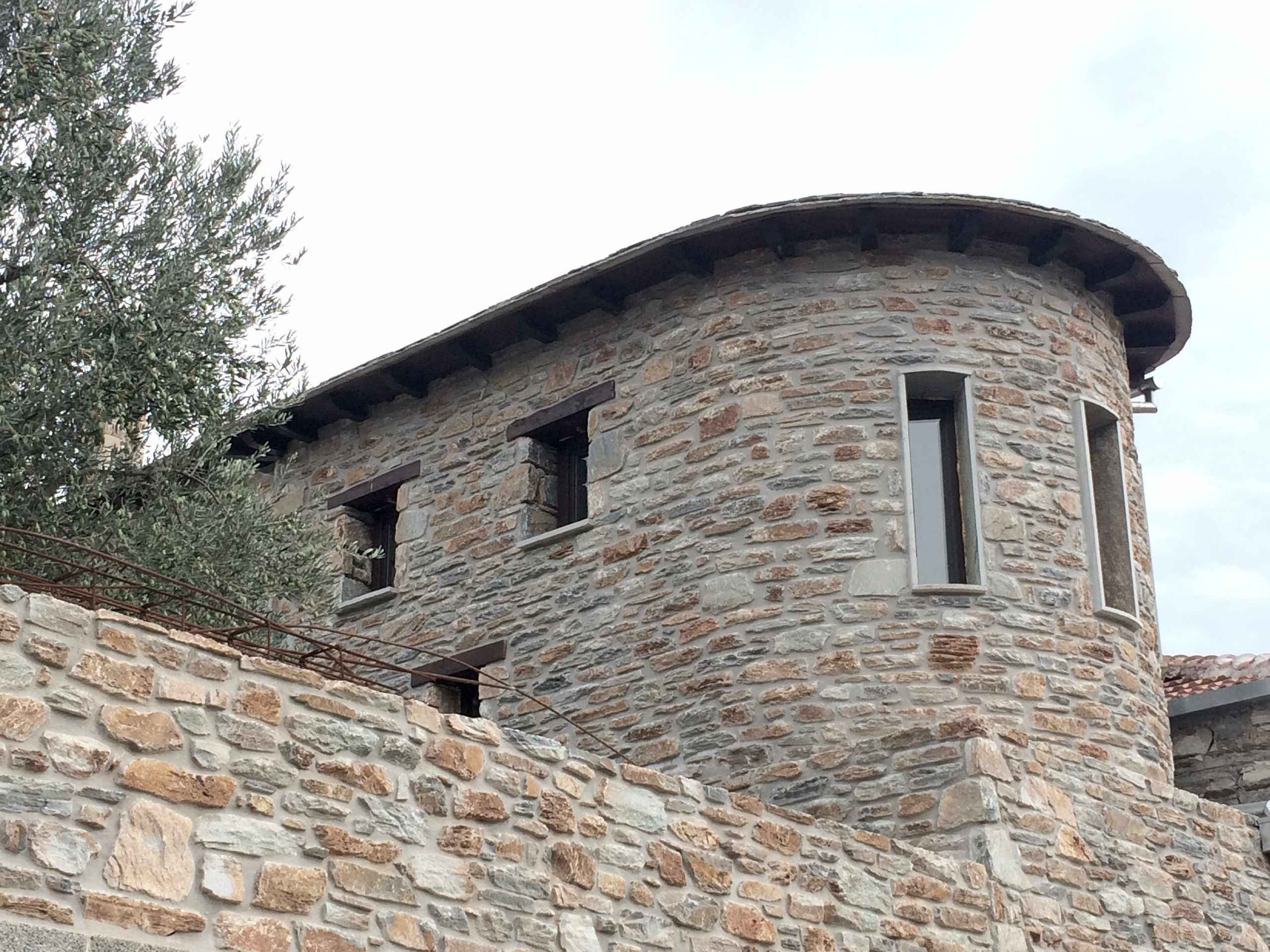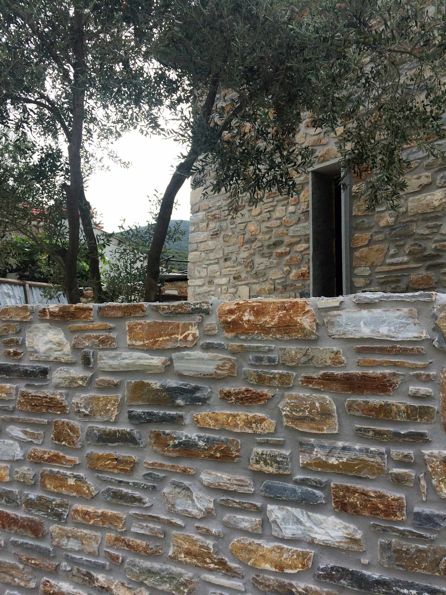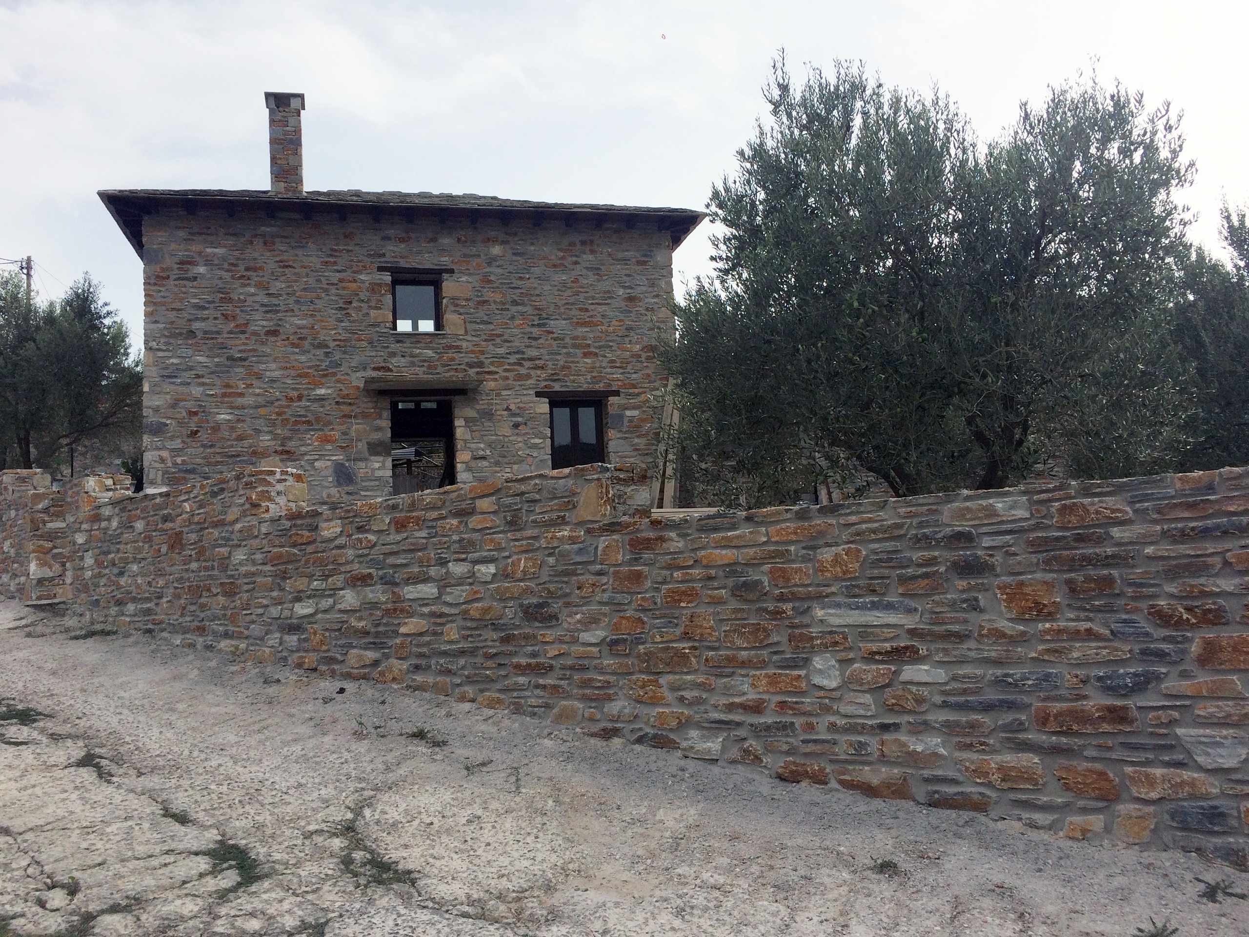 Stone House reconstruction Greece House in olive grove. Interior Shower Shower embrasures frame site of anti-Nazi embrasure in landscape built by the 54th regiment of E.L.A.S. (Greek People's Liberation Army). Nazi invasion: 1944.